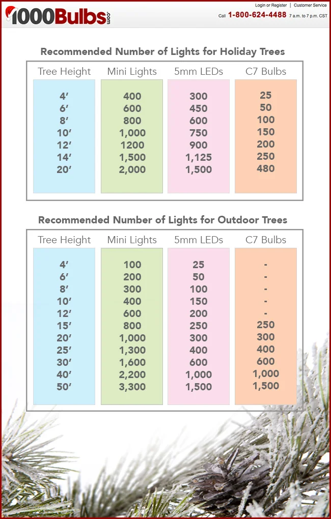 How Many Christmas Tree Lights Do I Need Bright Ideas from brightideas.partylights.com It does not tell you how many light strings you can connect together. Tree height number of lights 6 to 7 feet 400 to 700 7.5 to 8.5 feet 700 to 1,000 9 to 10 feet 1,000 to 1,300 12 feet 1,500 to 2,000 how do you make small trees look … Amazon.com has been visited by 1m+ users in the past month The rule of thumb is 100 lights for each foot, so 700 lights or 7 strands. Nov 04, 2011 · answers from detroit on november 05, 2011. What lights you choose to use will effect the overall outcome of the coverage on the tree. Please see the packaging on your led lights for more information. How many lights do you need for a 7 foot tree?